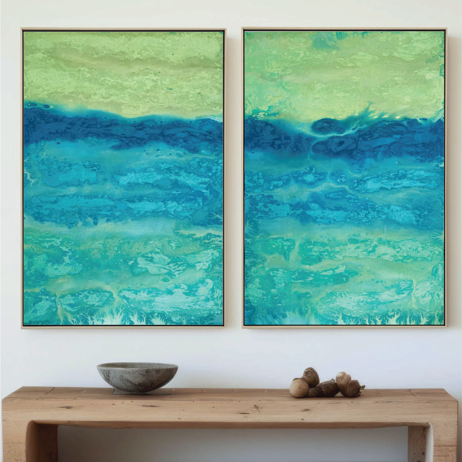 Lagoon No.4 Set brings together two harmonious canvases that flow with shifting tones of turquoise, sea green, and ocean blue. Layered in fluid textures, they echo the calm rhythm of coastal waters, adding a tranquil yet vibrant coastal spirit to your home.