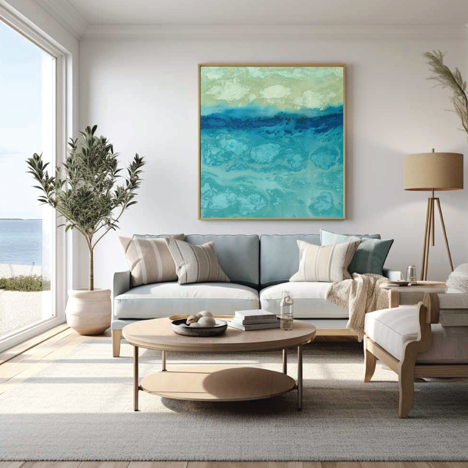 Lagoon No.4 Set brings together two harmonious canvases that flow with shifting tones of turquoise, sea green, and ocean blue. Layered in fluid textures, they echo the calm rhythm of coastal waters, adding a tranquil yet vibrant coastal spirit to your home.