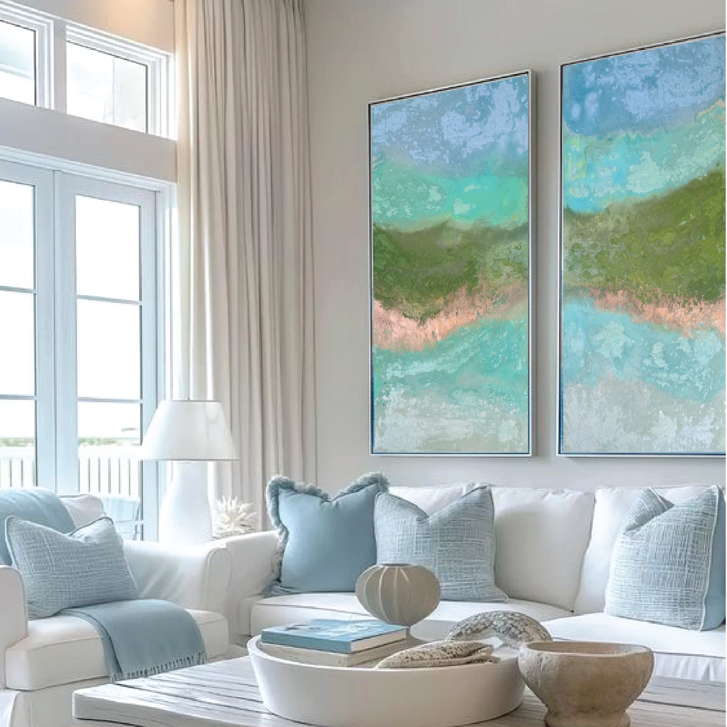 Mirage Set The mirage series captures the fleeting beauty of landscapes that shift between reality and illusion. With layered textures and fluid transitions of Aqua, Moss, coral and pearl. The artworks evoke the horizon where the sea meets the land . A memory of the sea dissolving into the sand, a dream-like view suspended in time. Perfect for contemporary interiors.